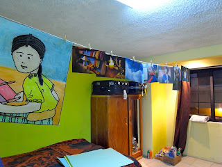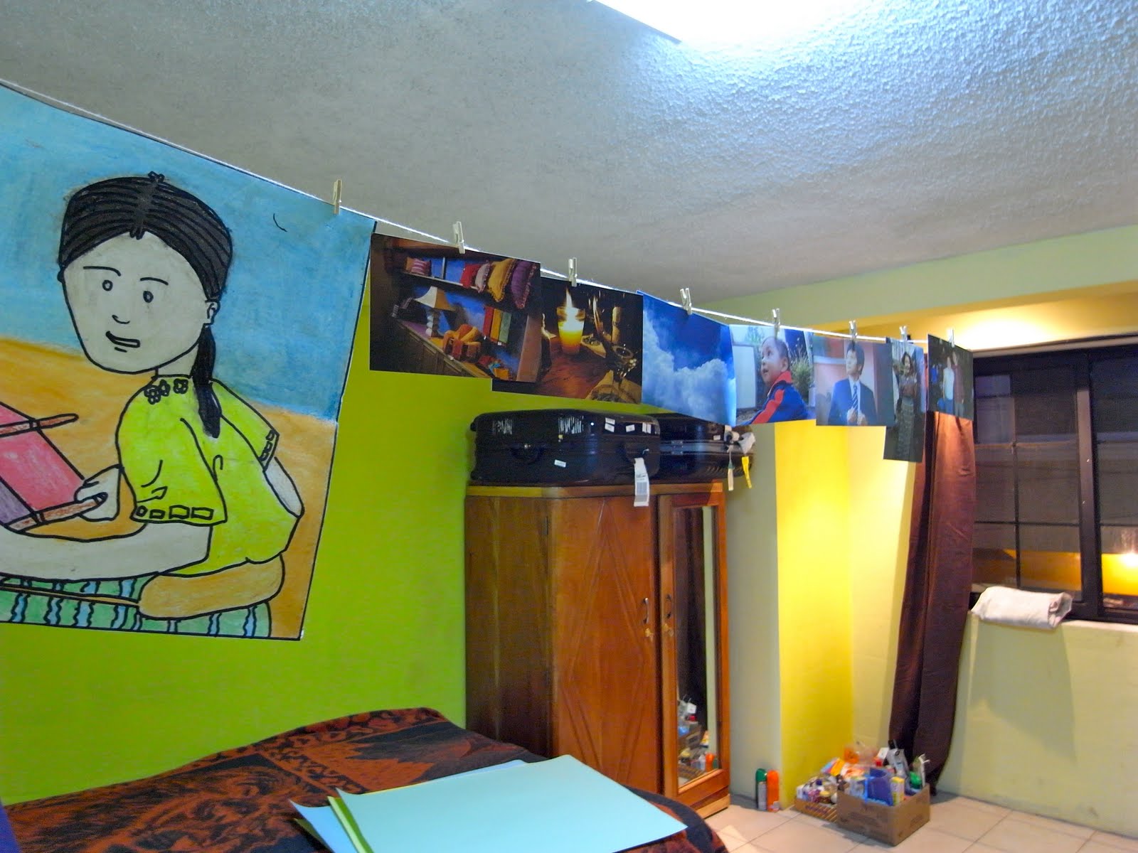 | 写真を吊るしてます。手前の絵は子どもからのプレゼント。 |